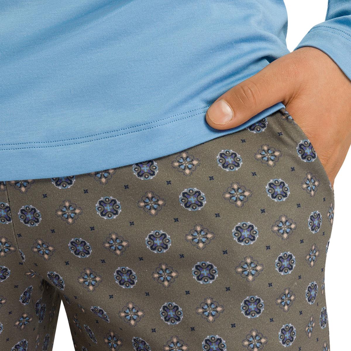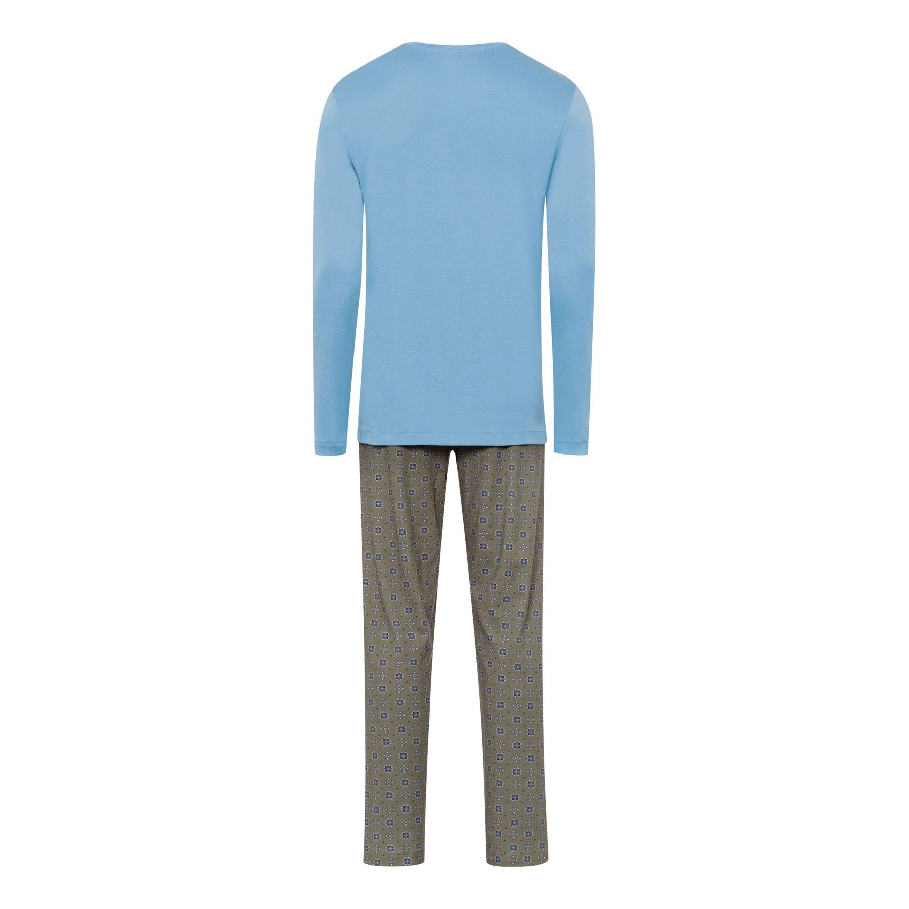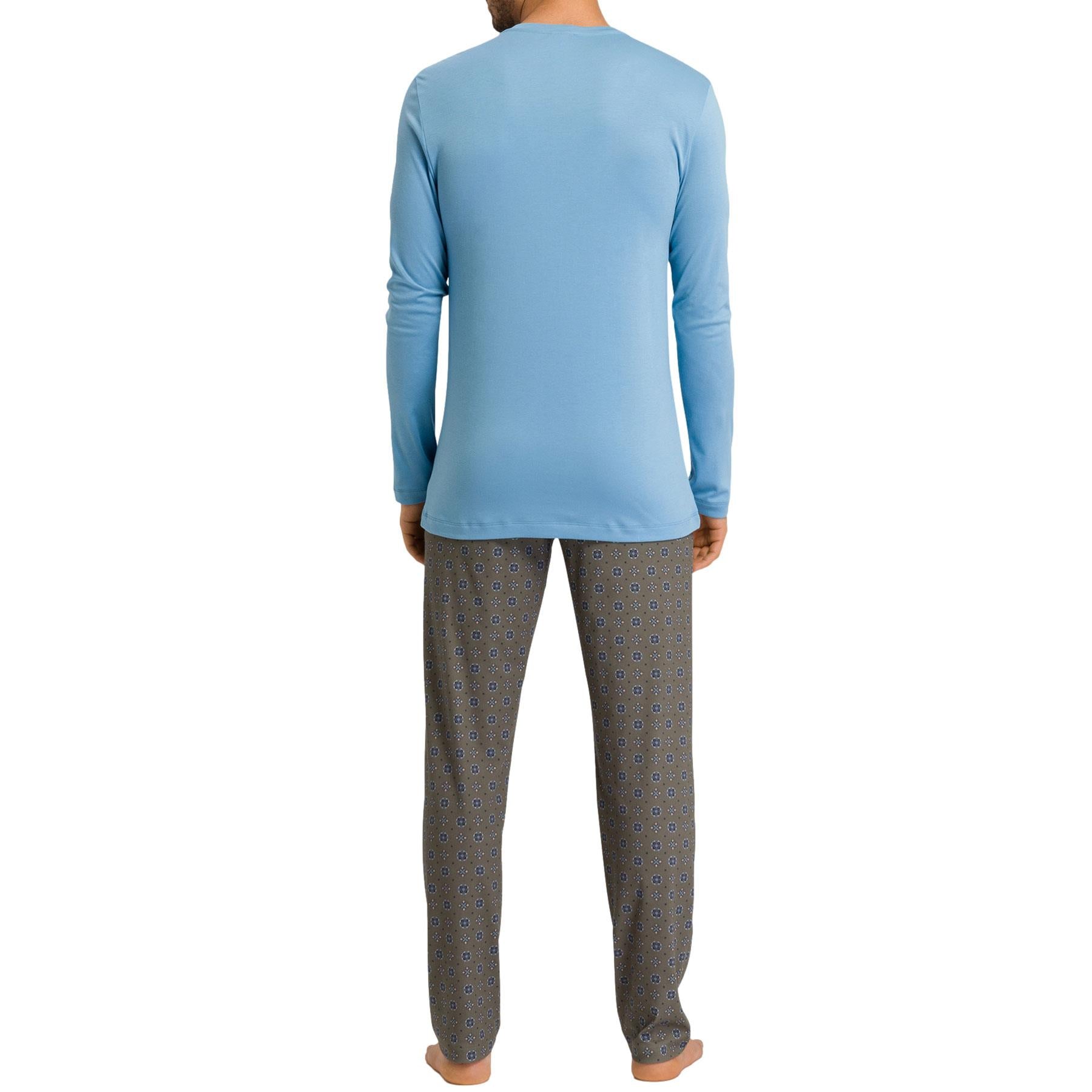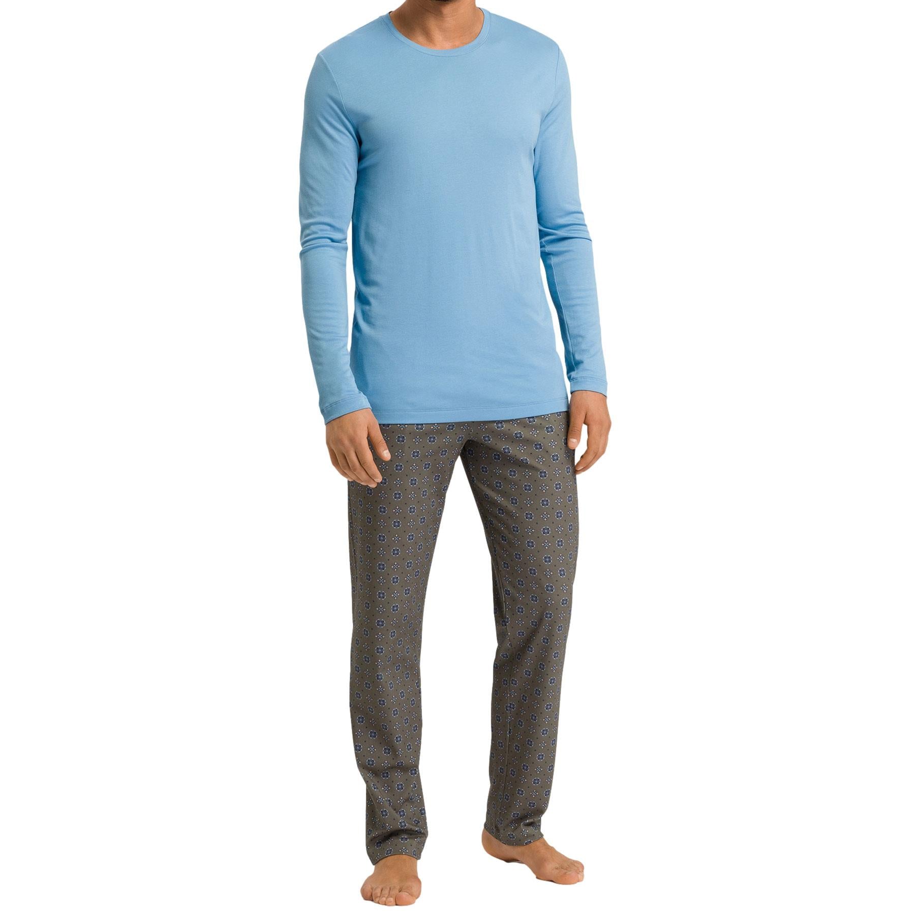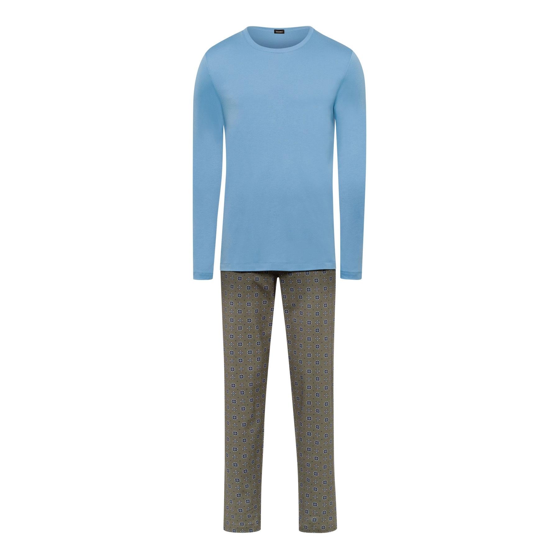 Look and feel luxurious all night long in Hanro's Night & Day Long Pyjamas. Modern styling and luxurious comfort in pure soft to the touch cotton. The round neck long sleeve pajama top is in plain blue and the long leg trousers with covered elasticated waistband are in Hanro's Antique Minimal print.